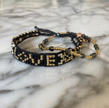 This stack of 5 bracelets includes a friendship band made from organic bamboo cotton woven with yellow gold metallic threads and black agate faceted positive energy stones, together with a stretch elastic bracelet with yellow gold hematite beads and 3 yellow gold bangles.